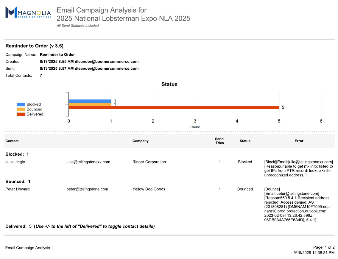 For a given event, lists all email campaigns that have been sent, with optional contact details. For Boomer Sender Score Service customers, the report also provides insight into deliverability. For more information about how you can obtain more detailed analysis with your campaigns, see this knowledgebase topic: