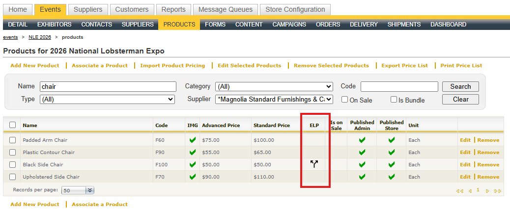 - When a product in an event has event level pricing and is not tied to the supplier level pricing, an icon will appear in the Products grid of the event. This is helpful for determining that if you change a supplier level price, whether the product within the event will be updated or not. The "ELP" column means "Event Level Pricing" and if it is independent of the supplier level pricing, a break away arrow icon appears.: