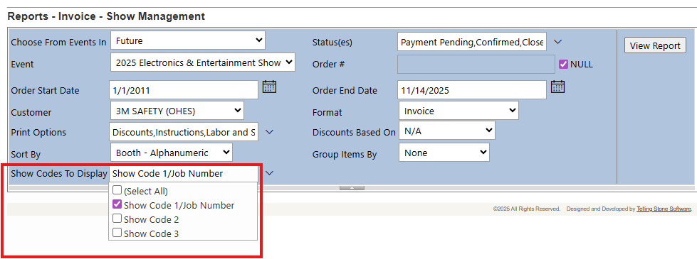 - The Invoice - Show Management report has a new parameter called "Show Codes to Display". It controls which show codes appear on the invoice. By default, only Show Code 1 (it may be known as Job Number in your system) will print: