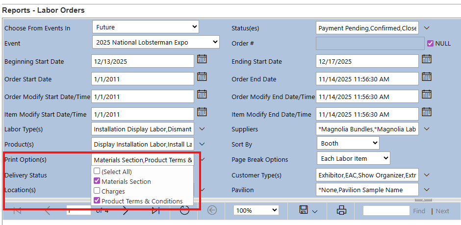 - Labor Orders (from the main Reports tab) now offers a Print Option to include a product's terms and conditions on the labor order. All controllable print options (Materials Section, Charges) were consolidated into that same parameter: