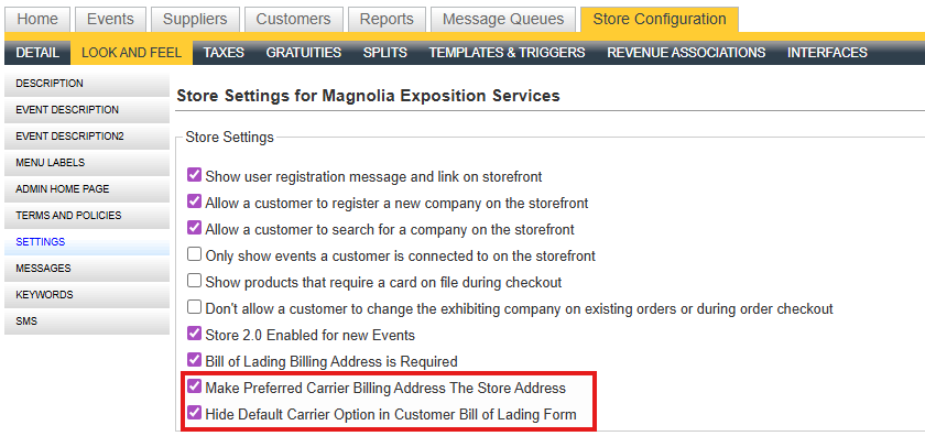 - The first setting allows the "Bill To" section to automatically populate with the store's name, address, service email and telephone when a preferred carrier is selected: