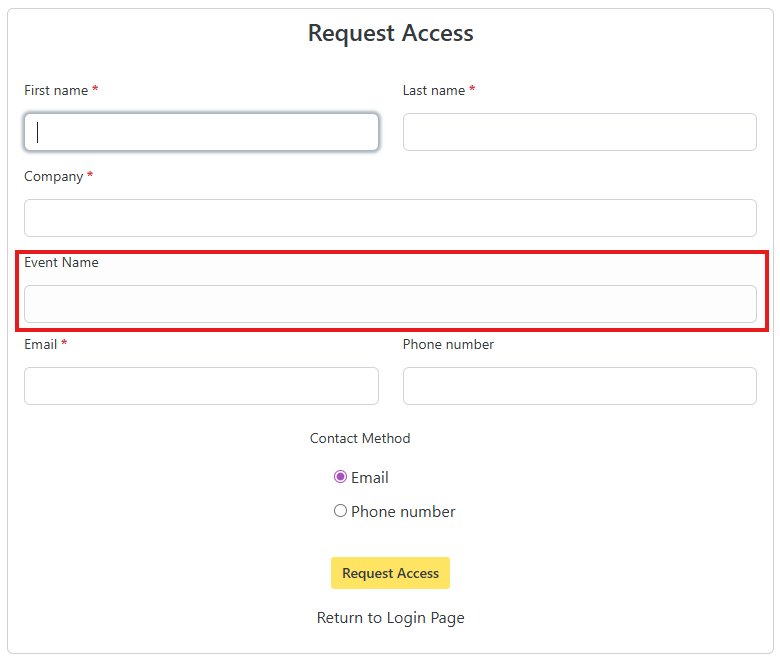 - When the customer submits a "Request Access" form, a new field for the Event is available. If the user was viewing a publicly available event and then chooses this option, the event name will automatically populate: