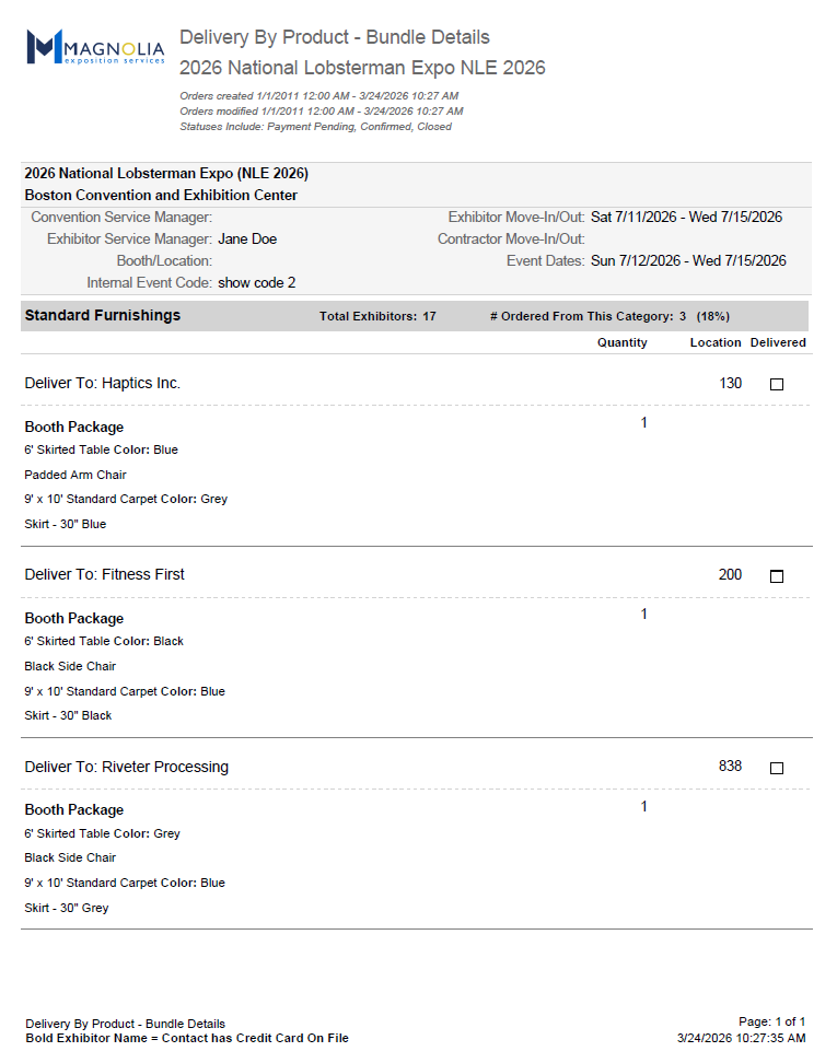 This report provides a list of all bundles ordered, listed for each exhibitor.