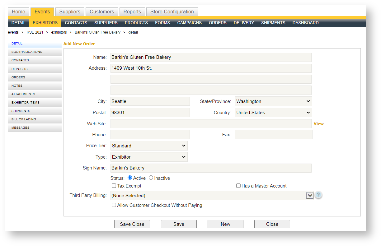 Clicking on an exhibitor within the grid launches the exhibitor detail for the exhibitor. A sub menu for the exhibitor appears: