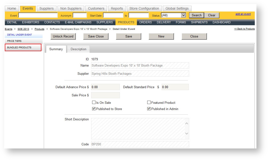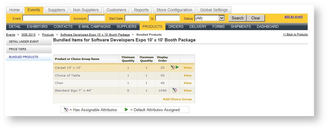 There may be times when you want to set up a booth package for a specific show. There may be specific offerings you are giving exhibitors just for the event, or there may be limitations on the color choices available. You can easily adjust a package at the event level to customize it to suit your needs.