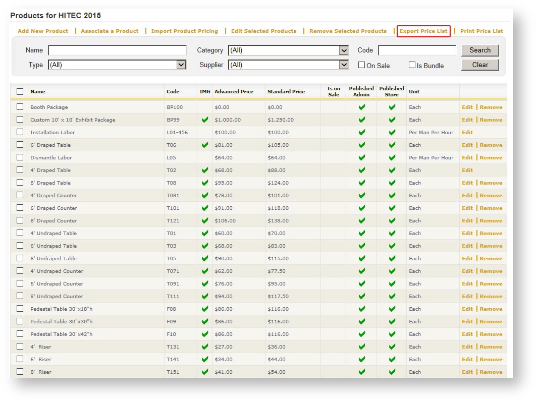 - From within the Products grid of the event, click "Export Price List":