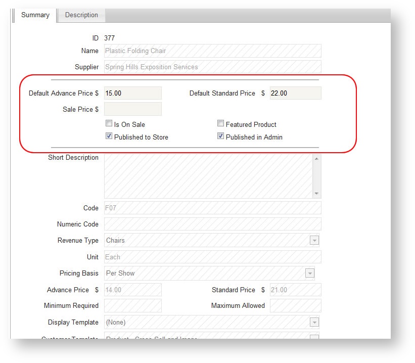 The only editable fields for a product within an event are the ones in between the two lines circled in red in the below image: