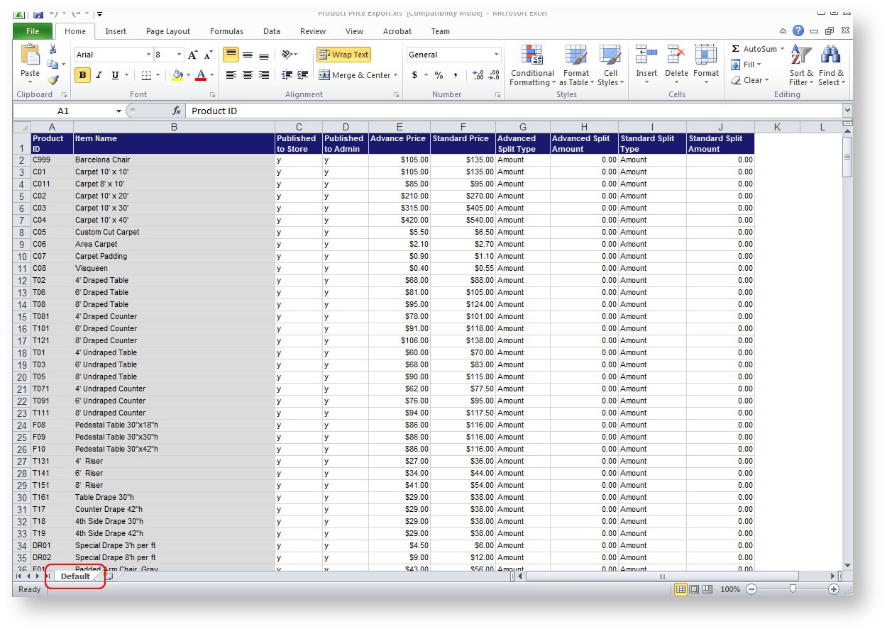 - Once in Excel, make any desired adjustments to the pricing as well as the columns that let you control whether the product is available on the Storefront and/or in Admin. Save the spreadsheet to a safe place.