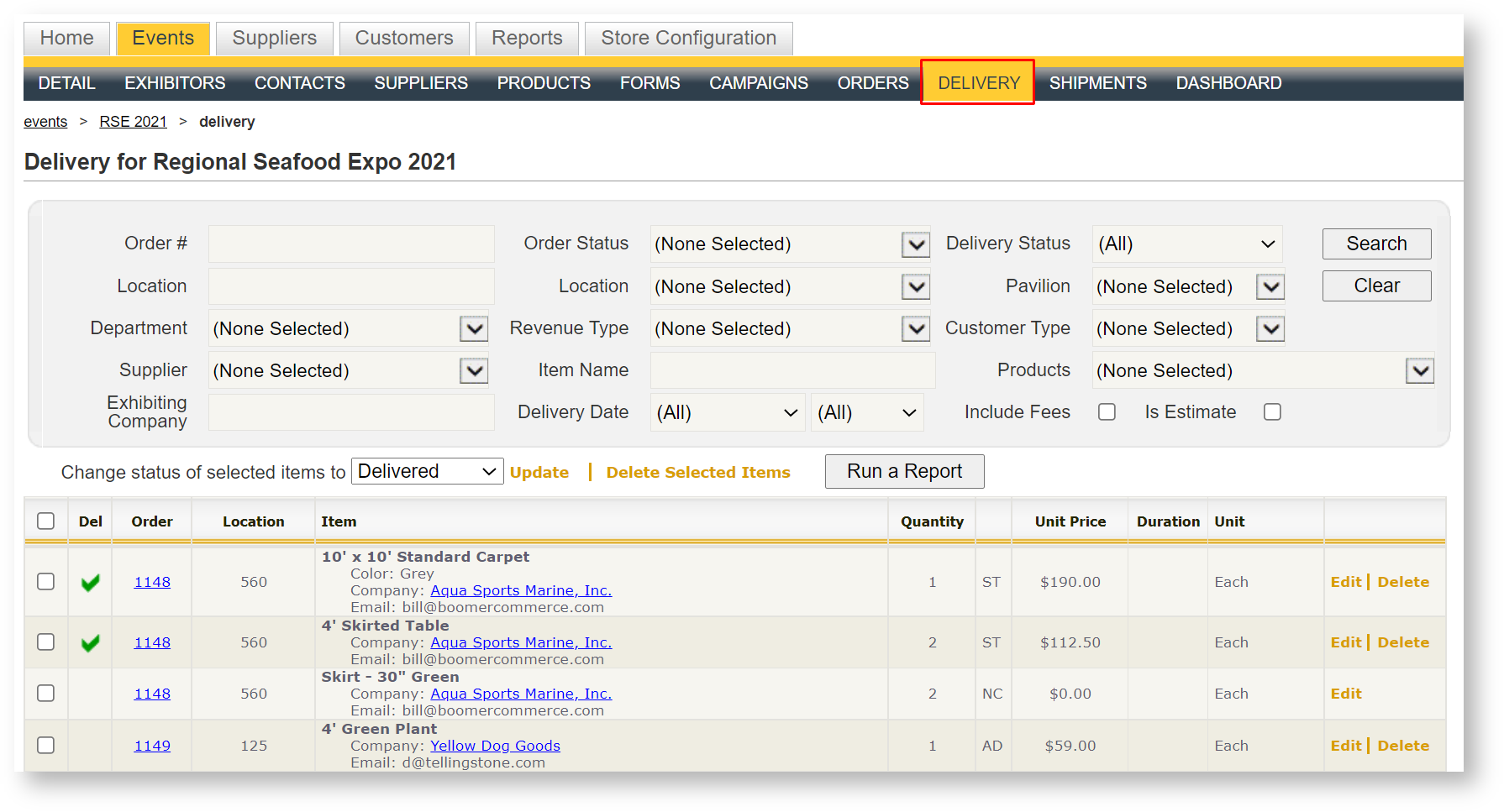 The Delivery grid presents all items that have been ordered across all orders. With its powerful filter capabilities, it allows the user to access items in orders that meet very specific criteria. While its name references its original intended purpose, which is to enable you to complete booth checks and mark products as being delivered to your customer, it has many other uses as well. A couple of examples include: