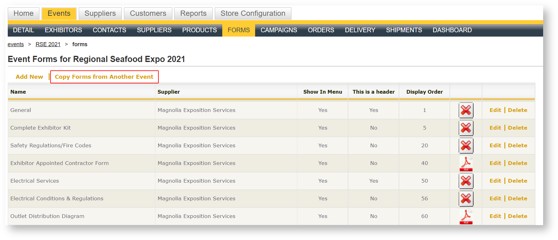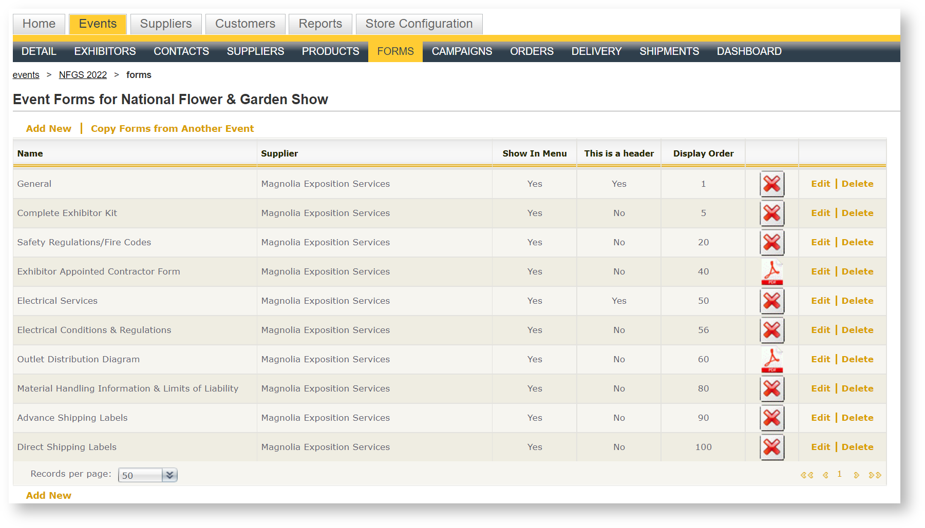 A form may be deleted at any time. To make a form no longer appear in the forms area for the Event, click "Delete" in the row of the form to be removed from the event's Storefront.