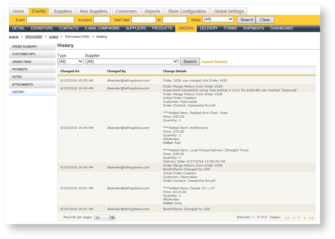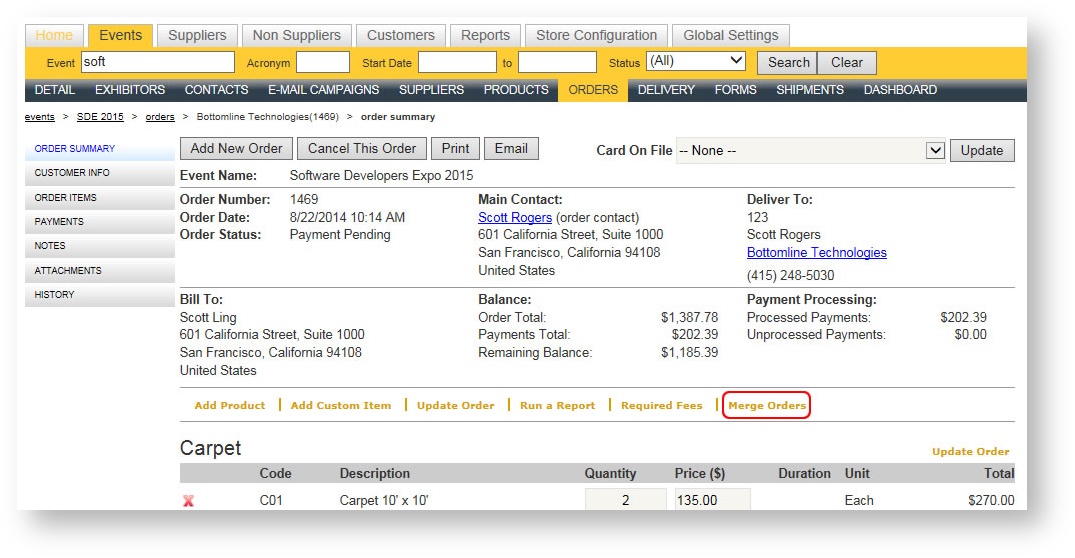 The merge orders command consolidates duplicate orders for a contact within an event. Its main purpose is to allow you to combine an order which may have a credit against an order which has a balance due. In order to have the ability to merge an order, the orders must be for the same exhibitor, order contact and booth/location within the same event.