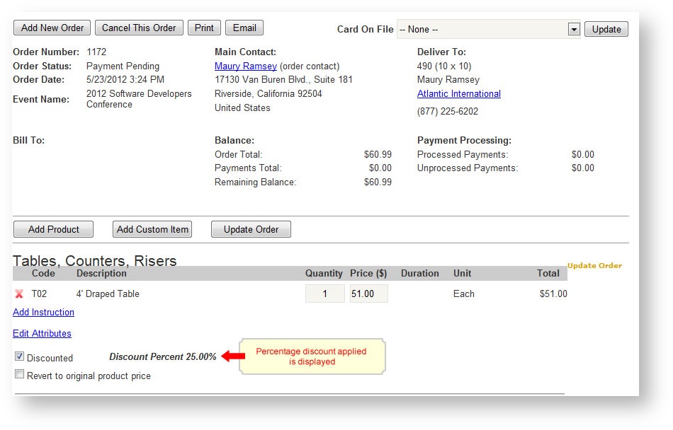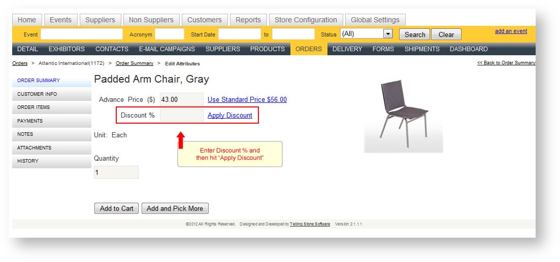In the process of adding the item to the cart, enter the Discount % into the Discount % field.  Click "Apply Discount". The price displayed changes to the discounted price.