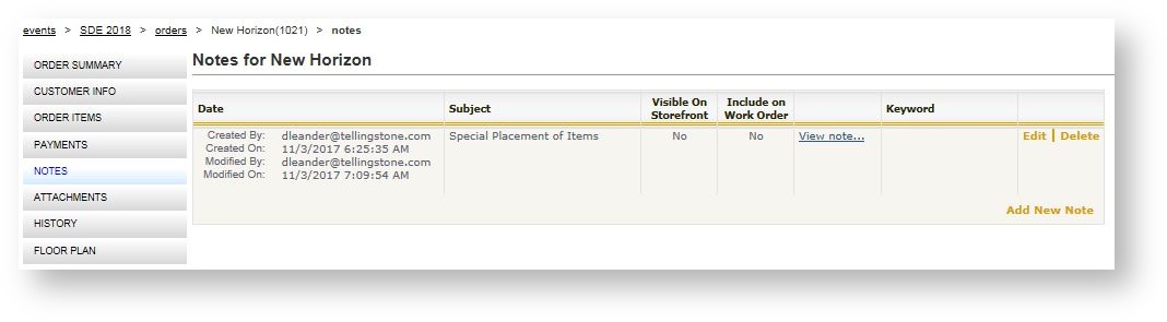 - Click "Notes" in the left navigation menu for the order.