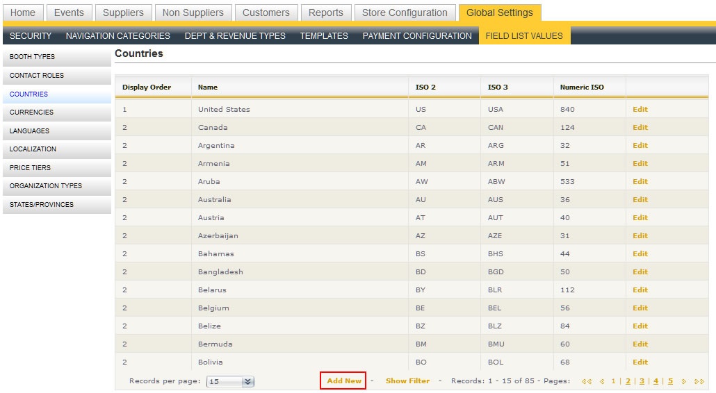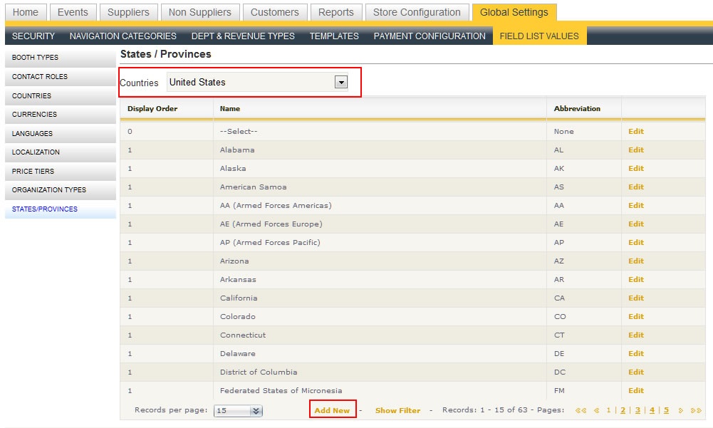 Boomer comes preloaded with the most commonly used countries and states. However, you can add additional countries and states depending on where your customers originate. To add countries and states, the logged in user must have access to your store's Global Settings.