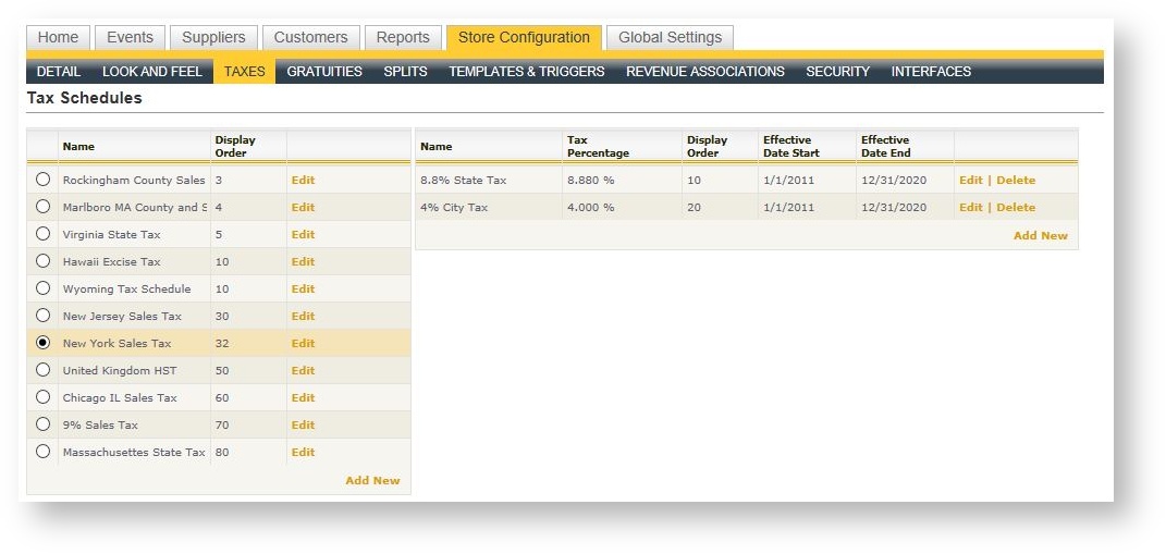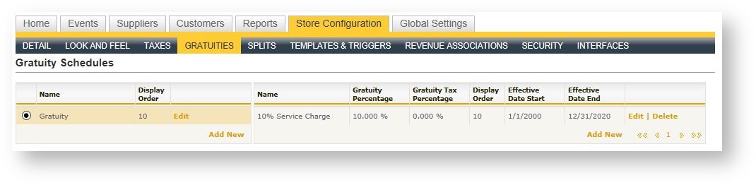 Tax and gratuity schedules allow various taxes or gratuities to be grouped together and then applied to revenue types that have been defined for the system. Products which are associated to those revenue types then "take on" those tax and gratuity schedules. The goal is to provide general tax and gratuity structures that can be used by each store with flexibility that assumes there might be different percentages for those structures.