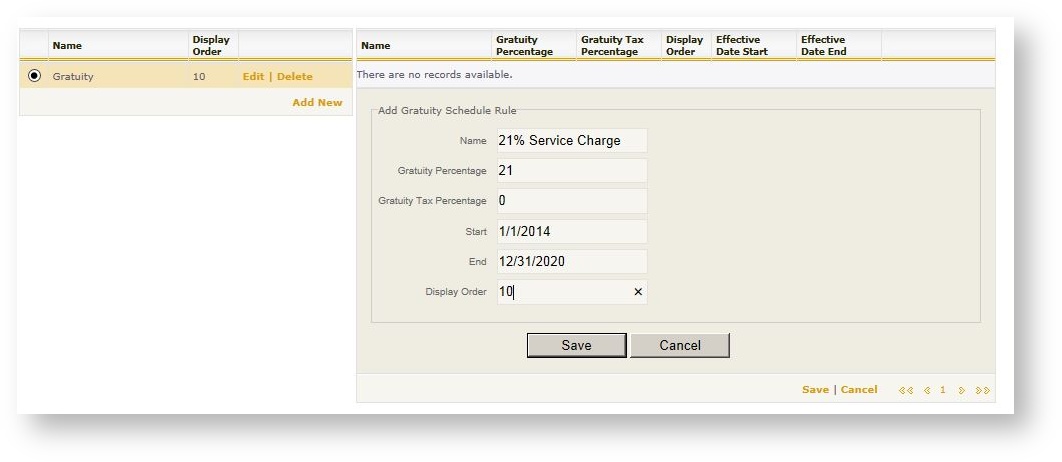 2. Click "Add New" in the gratuity rule grid (on the right hand side).
