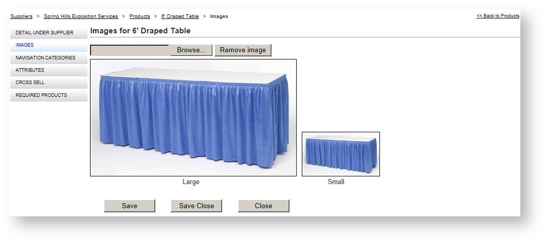 An image may be uploaded to represent a product. See image above to see where the image appears in the product detail. To add an image: