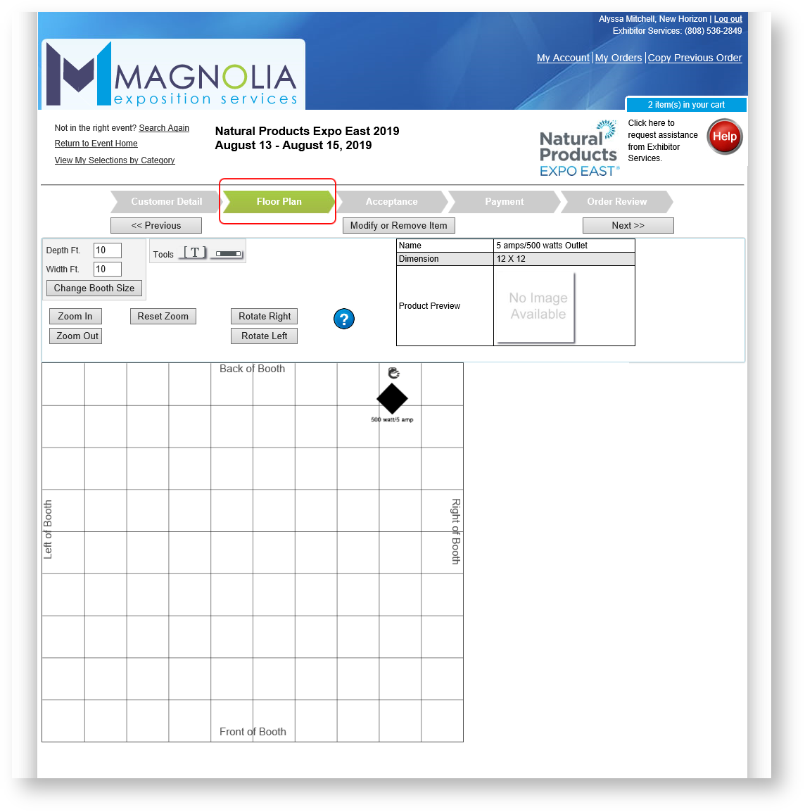 When a customer orders one or more items that need placement, the Floor Planner becomes part of the checkout process. The user drags and drops the items on the floor planner and then continues to checkout process as usual: